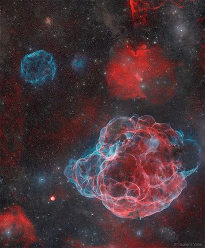 What happens after a star explodes? A huge fireball of hot gas shoots out in all directions. When this gas slams into the existing interstellar medium, it heats up so much it glows. Two different...