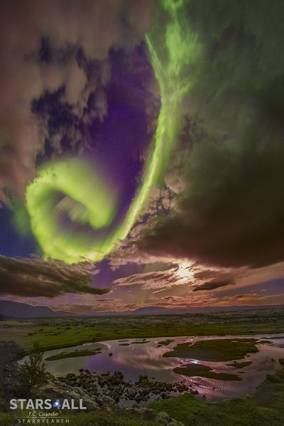 Admire the beauty but fear the beast. The beauty is the aurora overhead, here taking the form of a great green spiral, seen between picturesque clouds with the bright Moon to the side and stars in...