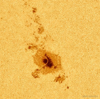 Why would a small part of the Sun appear slightly dark? Visible is a close-up picture of sunspots, depressions on the Sun's surface that are slightly cooler and less bright than the rest of the...