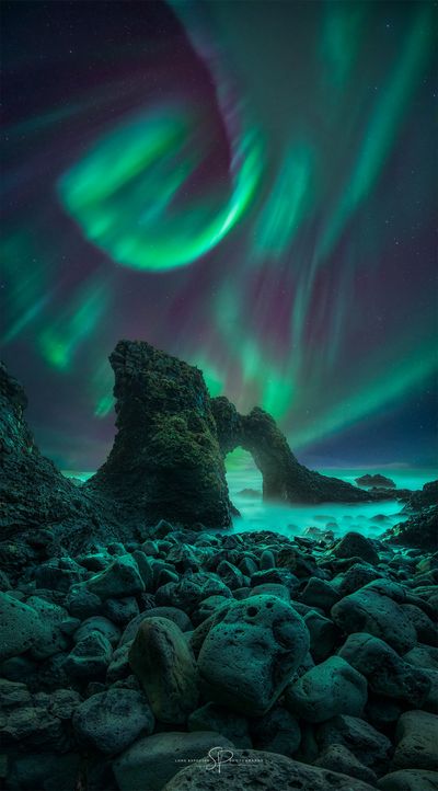 The scene may look like a fantasy, but it's really Iceland. The rock arch is named Gatklettur and located on the island's northwest coast. Some of the larger rocks in the foreground span a...