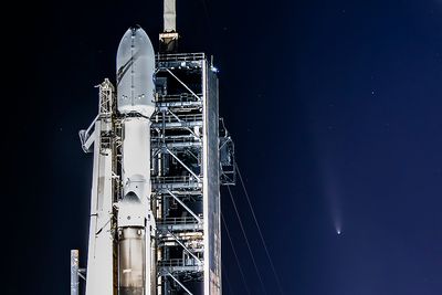 NASA's Europa Clipper is now headed toward an ocean world beyond Earth. The large spacecraft is tucked into the payload fairing atop the Falcon Heavy rocket in this photo, taken at Kennedy...