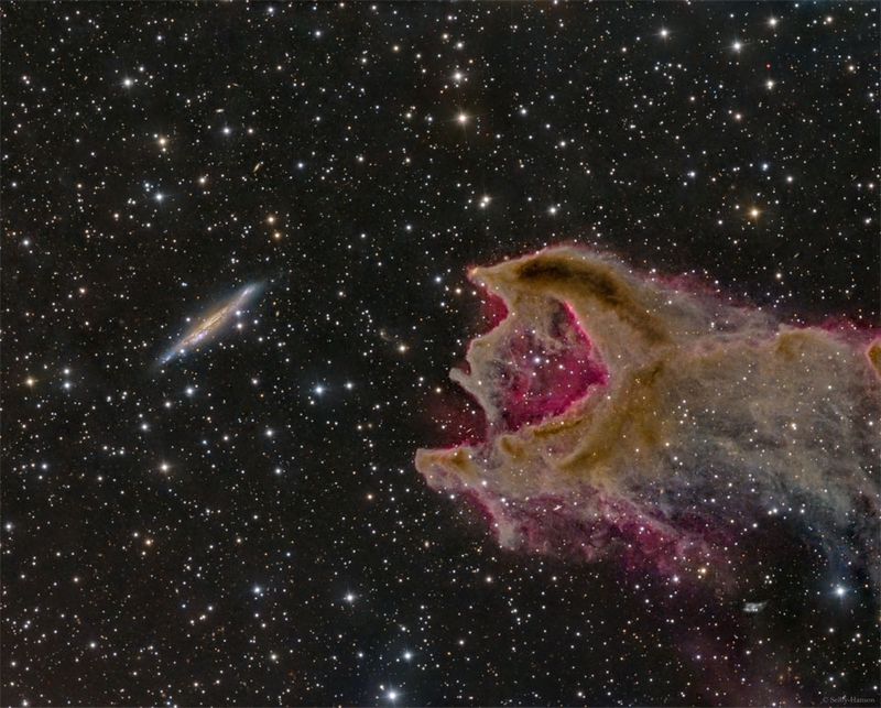 Can a gas cloud eat a galaxy? It's not even close. The "claw" of this odd looking "creature" in the featured photo is a gas cloud known as a cometary globule. This globule, however, has ruptured. Cometary globules are typically characterized by dusty heads and elongated tails. These features cause cometary globules to have visual similarities to comets, but in reality they are very much different. Globules are frequently the birthplaces of stars, and many show very young stars in their heads. The reason for the rupture in the head of this object is not yet known. The galaxy to the left of the globule is huge, very far in the distance, and only placed near CG4 by chance superposition. Discovery + Outreach: Graduate student research position open for APOD