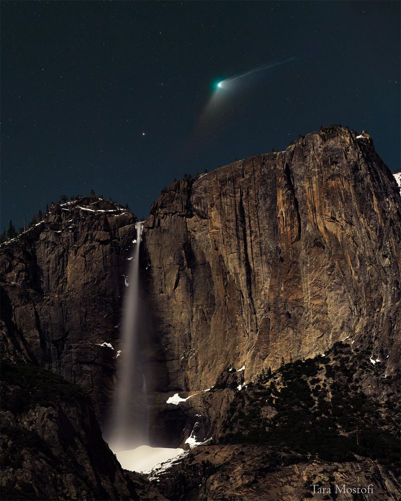 They are both falling. The water in Yosemite Falls, California, USA, is falling toward the Earth. Comet ZTF is falling toward the Sun. This double cosmic cascade was captured late last month as fading Comet C/2022 E3 (ZTF) had just passed its closest to planet Earth. The orange star just over the falls is Kochab. With the exception of a brief encounter with a black bear, the featured image was a well-planned composite of a moonlit-foreground and long-duration background exposures - all designed to reconstruct a deep version of an actual single sight. Although Comet ZTF is now fading as it glides back to the outer Solar System, its path is determined by gravity and so it can be considered to still be falling toward the Sun -- but backwards. Comet ZTF Gallery: Notable Submissions to APOD