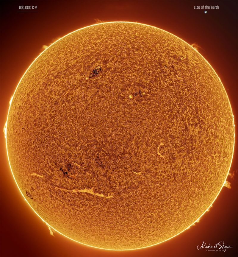 Our Sun is becoming a busy place. Only two years ago, the Sun was emerging from a solar minimum so quiet that months would go by without even a single sunspot. In contrast, already this year and well ahead of schedule, our Sun is unusually active, already nearing solar activity levels seen a decade ago during the last solar maximum. Our increasingly active Sun was captured two weeks ago sporting numerous interesting features. The image was recorded in a single color of light called Hydrogen Alpha, color-inverted, and false colored. Spicules carpet much of the Sun's face. The brightening towards the Sun's edges is caused by increased absorption of relatively cool solar gas and called limb darkening. Just outside the Sun's disk, several scintillating prominences protrude, while prominences on the Sun's face are known as filaments and show as light streaks. Magnetically tangled active regions are both dark and light and contain cool sunspots. As our Sun's magnetic field winds toward solar maximum over the next few years, whether the Sun's high activity will continue to increase is unknown.