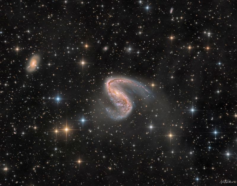 Distorted galaxy NGC 2442 can be found in the southern constellation of the flying fish, (Piscis) Volans. Located about 50 million light-years away, the galaxy's two spiral arms extending from a pronounced central bar give it a hook-shaped appearance in this deep colorful image, with spiky foreground stars scattered across the telescopic field of view. The image also reveals the distant galaxy's obscuring dust lanes, young blue star clusters and reddish star forming regions surrounding a core of yellowish light from an older population of stars. But the star forming regions seem more concentrated along the drawn-out (upper right) spiral arm. The distorted structure is likely the result of an ancient close encounter with the smaller galaxy seen near the top left of the frame. The two interacting galaxies are separated by about 150,000 light-years at the estimated distance of NGC 2442.