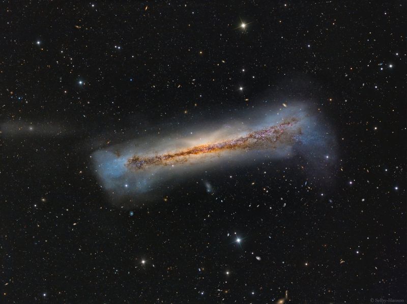 Sharp telescopic views of NGC 3628 show a puffy galactic disk divided by dark dust lanes. Of course, this portrait of the magnificent, edge-on spiral galaxy puts some astronomers in mind of its popular moniker, the Hamburger Galaxy. It also reveals a small galaxy nearby (below), likely a satellite of NGC 3628, and a very faint but extensive tidal tail. The drawn out tail stretches for about 300,000 light-years, even beyond the left edge of the frame. NGC 3628 shares its neighborhood in the local universe with two other large spirals M65 and M66 in a grouping otherwise known as the Leo Triplet. Gravitational interactions with its cosmic neighbors are likely responsible for creating the tidal tail, as well as the extended flare and warp of this spiral's disk. The tantalizing island universe itself is about 100,000 light-years across and 35 million light-years away in the northern springtime constellation Leo.