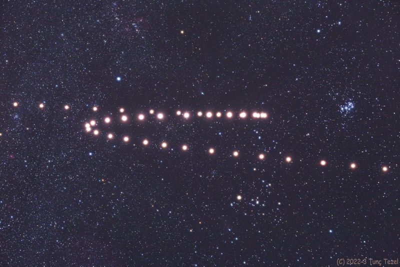 A composite of images captured about a week apart from mid August 2022 through late March 2023, this series traces the retrograde motion of ruddy-colored Mars. Progressing from lower right to upper left Mars makes a Z-shaped path as it wanders past the Pleiades and Hyades star clusters, through the constellation Taurus in planet Earth's night sky. Seen about every two years, Mars doesn't actually reverse the direction of its orbit to trace out the Z-shape though. Instead, the apparent backwards or retrograde motion with respect to the background stars is a reflection of the orbital motion of Earth itself. Retrograde motion can be seen each time Earth overtakes and laps planets orbiting farther from the Sun, the Earth moving more rapidly through its own relatively close-in orbit. High in northern hemisphere skies the Red Planet was opposite the Sun and at its closest and brightest on December 8, near the center of the frame. Seen close to Mars, a popular visitor to the inner Solar System, comet ZTF (C/2022 E3), was also captured on two dates, February 10 and February 16.