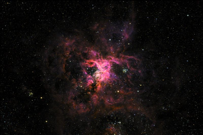 The Tarantula Nebula, also known as 30 Doradus, is more than a thousand light-years in diameter, a giant star forming region within nearby satellite galaxy the Large Magellanic Cloud. About 160 thousand light-years away, it's the largest, most violent star forming region known in the whole Local Group of galaxies. The cosmic arachnid is near the center of this spectacular image taken during the flight of SuperBIT (Super Pressure Balloon Imaging Telescope), NASA's balloon-borne 0.5 meter telescope now floating near the edge of space. Within the well-studied Tarantula (NGC 2070), intense radiation, stellar winds and supernova shocks from the central young cluster of massive stars, cataloged as R136, energize the nebular glow and shape the spidery filaments. Around the Tarantula are other star forming regions with young star clusters, filaments, and blown-out bubble-shaped clouds. SuperBIT's field of view spans about 1/3 of a degree in the southern constellation Dorado.