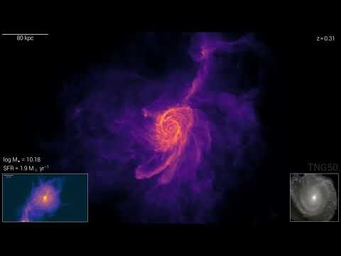 How did we get here? We know that we live on a planet orbiting a star orbiting a galaxy, but how did all of this form? Since our universe moves too slowly to watch, faster-moving computer simulations are created to help find out. Specifically, this featured video from the IllustrisTNG collaboration tracks gas from the early universe (redshift 12) until today (redshift 0). As the simulation begins, ambient gas falls into and accumulates in a region of relatively high gravity. After a few billion years, a well-defined center materializes from a strange and fascinating cosmic dance. Gas blobs -- some representing small satellite galaxies -- continue to fall into and become absorbed by the rotating galaxy as the present epoch is reached and the video ends. For the Milky Way Galaxy, however, big mergers may not be over -- recent evidence indicates that our large spiral disk Galaxy will collide and coalesce with the slightly larger Andromeda spiral disk galaxy in the next few billion years. Open Science: Browse 3,000+ codes in the Astrophysics Source Code Library