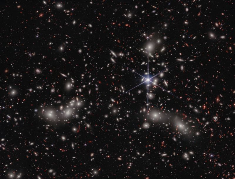 This deep field mosaicked image presents a stunning view of galaxy cluster Abell 2744 recorded by the James Webb Space Telescope's NIRCam. Also dubbed Pandora's Cluster, Abell 2744 itself appears to be a ponderous merger of three different massive galaxy clusters. It lies some 3.5 billion light-years away, toward the constellation Sculptor. Dominated by dark matter, the mega-cluster warps and distorts the fabric of spacetime, gravitationally lensing even more distant objects. Redder than the Pandora cluster galaxies many of the lensed sources are very distant galaxies in the early Universe, their lensed images stretched and distorted into arcs. Of course distinctive diffraction spikes mark foreground Milky Way stars. At the Pandora Cluster's estimated distance this cosmic box spans about 6 million light-years. But don't panic. You can explore the tantalizing region in a 2 minute video tour.