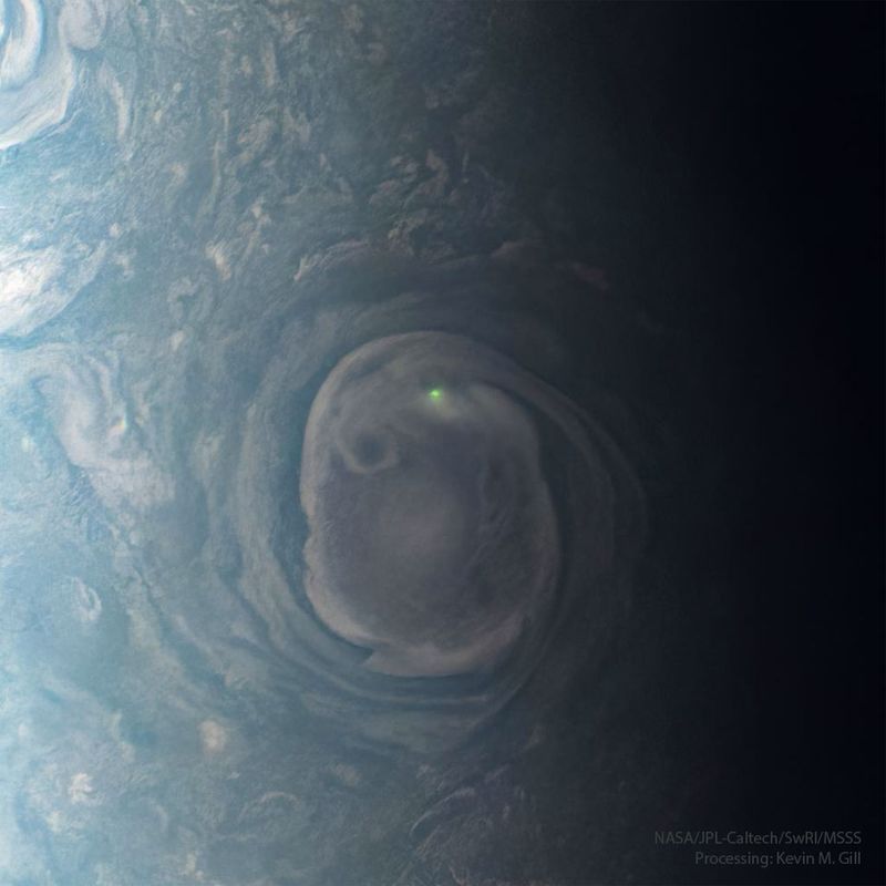 Does lightning occur only on Earth? No. Spacecraft in our Solar System have detected lightning on other planets, including Mars, Jupiter and Saturn, and lightning is likely on Venus, Uranus, and Neptune. Lightning is a sudden rush of electrically charged particles from one location to another. On Earth, drafts of colliding ice and water droplets usually create lightning-generating charge separation, but what happens on Jupiter? Images and data from NASA's Jupiter-orbiting Juno spacecraft bolster previous speculation that Jovian lightning is also created in clouds containing water and ice. In the featured Juno photograph, an optical flash was captured in a large cloud vortex near Jupiter's north pole. During the next few months, Juno will perform several close sweeps over Jupiter's night side, likely allowing the robotic probe to capture more data and images of Jovian lightning.