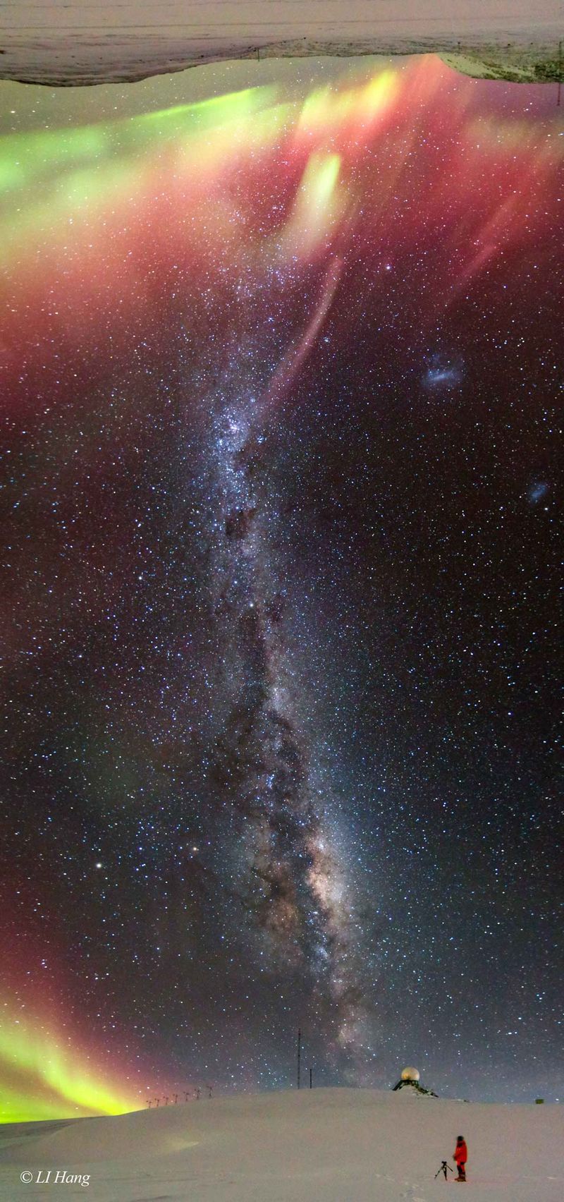 It was one of the better skies of this long night. In parts of Antarctica, not only is it winter, but the Sun can spend weeks below the horizon. At China's Zhongshan Station, people sometimes venture out into the cold to photograph a spectacular night sky. The featured image from one such outing was taken in mid-July of 2015, just before the end of this polar night. Pointing up, the wide angle lens captured not only the ground at the bottom, but at the top as well. In the foreground, a colleague is taking pictures. In the distance, a spherical satellite receiver and several windmills are visible. Numerous stars dot the night sky, including Sirius and Canopus. Far in the background, stretching overhead from horizon to horizon, is the central band of our Milky Way Galaxy. Even further in the distance, visible as extended smudges near the top, are the Large and Small Magellanic Clouds, satellite galaxies near our huge Milky Way Galaxy. Explore the Universe: Random APOD Generator