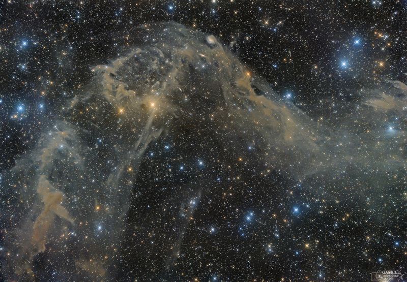 The combined light of stars along the Milky Way are reflected by these cosmic dust clouds that soar 300 light-years or so above the plane of our galaxy. Known to some as integrated flux nebulae and commonly found at high galactic latitudes, the dusty galactic cirrus clouds are faint. But they can be traced over large regions of the sky toward the North and South Galactic poles. Along with the reflection of starlight, studies indicate the dust clouds produce a faint reddish luminescence as interstellar dust grains convert invisible ultraviolet radiation to visible red light. Also capturing nearby Milky Way stars and distant background galaxies, this remarkably deep, wide-field image explores a complex of faint galactic cirrus known as Mandel Wilson 9. It spans over three degrees across planet Earth's skies toward the far southern constellation Apus.