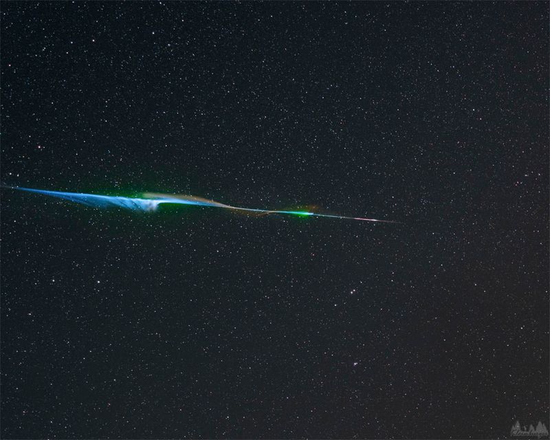 Meteors can be colorful. While the human eye usually cannot discern many colors, cameras often can. Pictured here is a fireball, a disintegrating meteor that was not only one of the brightest the photographer has ever seen, but colorful. The meteor was captured by chance in mid-July with a camera set up on Hochkar Mountain in Austria to photograph the central band of our Milky Way galaxy. The radiant grit, likely cast off by a comet or asteroid long ago, had the misfortune to enter Earth's atmosphere. Colors in meteors usually originate from ionized chemical elements released as the meteor disintegrates, with blue-green typically originating from magnesium, calcium radiating violet, and nickel glowing green. Red, however, typically originates from energized nitrogen and oxygen in the Earth's atmosphere. This bright meteoric fireball was gone in a flash -- less than a second -- but it left a wind-blown ionization trail that remained visible for almost a minute.