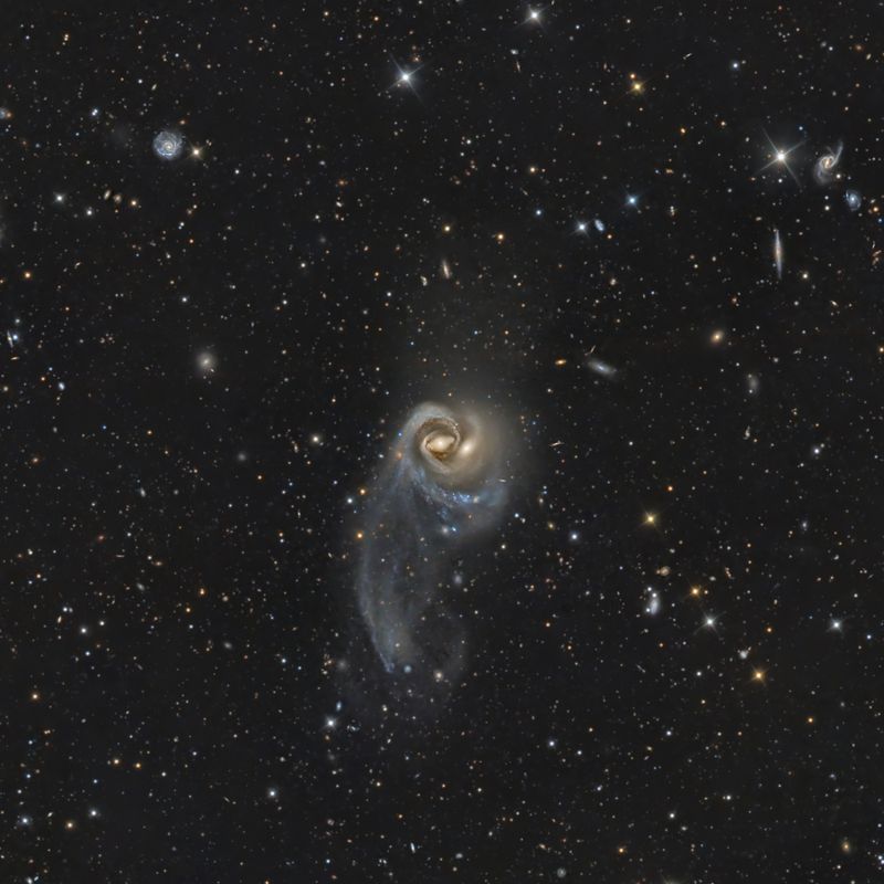 Locked in a cosmic embrace, two large galaxies are merging at the center of this sharp telescopic field of view. The interacting system cataloged as Arp 93 is some 200 million light-years distant toward the constellation Aquarius in planet Earth's sky. Individually the galaxies are identified as NGC 7285 (right) and NGC 7284. Their bright cores are still separated by about 20,000 light-years or so, but a massive tidal stream, a result of their ongoing gravitational interaction, extends over 200,000 light-years toward the bottom of the frame. Interacting galaxies do look peculiar, but are now understood to be common in the Universe. In fact, closer to home, the large spiral Andromeda Galaxy is known to be approaching the Milky Way. Arp 93 may well present an analog of their distant future cosmic embrace. Notable submissions to APOD: Perseids Meteor Shower 2023