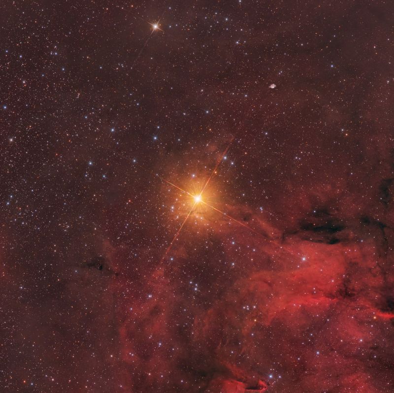 Mu Cephei is a very large star. An M-class supergiant some 1500 times the size of the Sun, it is one of the largest stars visible to the unaided eye, and even one of the largest in the entire Galaxy. If it replaced the Sun in our fair Solar System, Mu Cephei would easily engulf Mars and Jupiter. Historically known as Herschel's Garnet Star, Mu Cephei is extremely red. Approximately 2800 light-years distant, the supergiant is seen near the edge of reddish emission nebula IC 1396 toward the royal northern constellation Cepheus in this telescopic view. Much cooler and hence redder than the Sun, this supergiant's light is further reddened by absorption and scattering due to intervening dust within the Milky Way. A well-studied variable star understood to be in a late phase of stellar evolution, Mu Cephei is a massive star too, destined to ultimately explode as a core-collapse supernova.