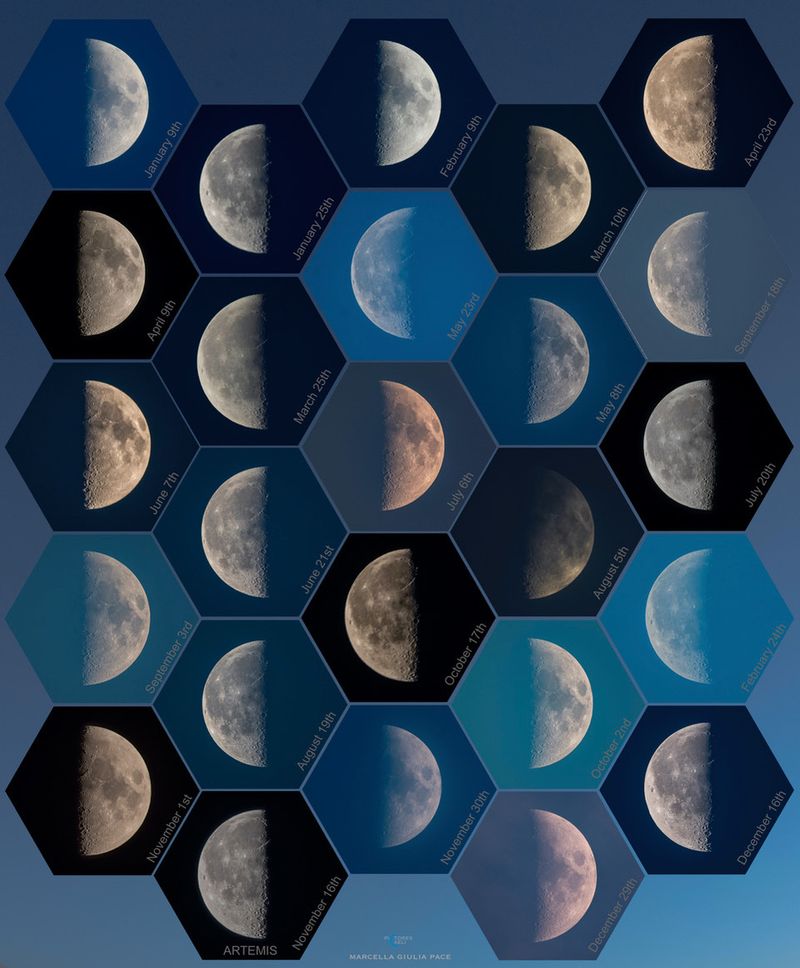 Half way between New Moon and Full Moon is the Moon's first quarter phase. That's a quarter of the way around its moonthly orbit. At the first quarter phase, half the Moon's visible side is illuminated by sunlight. For the Moon's third quarter phase, half way between Full Moon and New Moon, sunlight illuminates the other half of the visible lunar disk. At both first and third quarter phases, the terminator, or shadow line separating the lunar night and day, runs down the middle. Near the terminator, long shadows bring lunar craters and mountains in to sharp relief, making the quarter phases a good time to observe the Moon. But in case you missed some, all the quarter phases of the Moon and their calendar dates during 2022 can be found in this well-planned array of telephoto images. Of course, you can observe a first quarter Moon tonight. International: Observe the Moon Night
