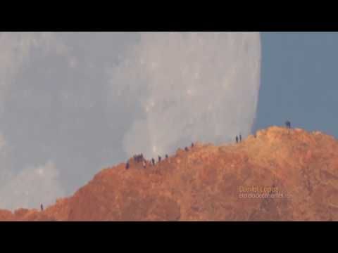These people are not in danger. What is coming down from the left is just the Moon, far in the distance. Luna appears so large here because she is being photographed through a telescopic lens. What is moving is mostly the Earth, whose spin causes the Moon to slowly disappear behind Mount Teide, a volcano in the Canary Islands off the northwest coast of Africa. The people pictured are 16 kilometers away and many are facing the camera because they are watching the Sun rise behind the photographer. It is not a coincidence that a full moon rises just when the Sun sets because the Sun is always on the opposite side of the sky from a full moon. The featured video was made in 2018 during the full Milk Moon. The video is not time-lapse -- this was really how fast the Moon was setting.