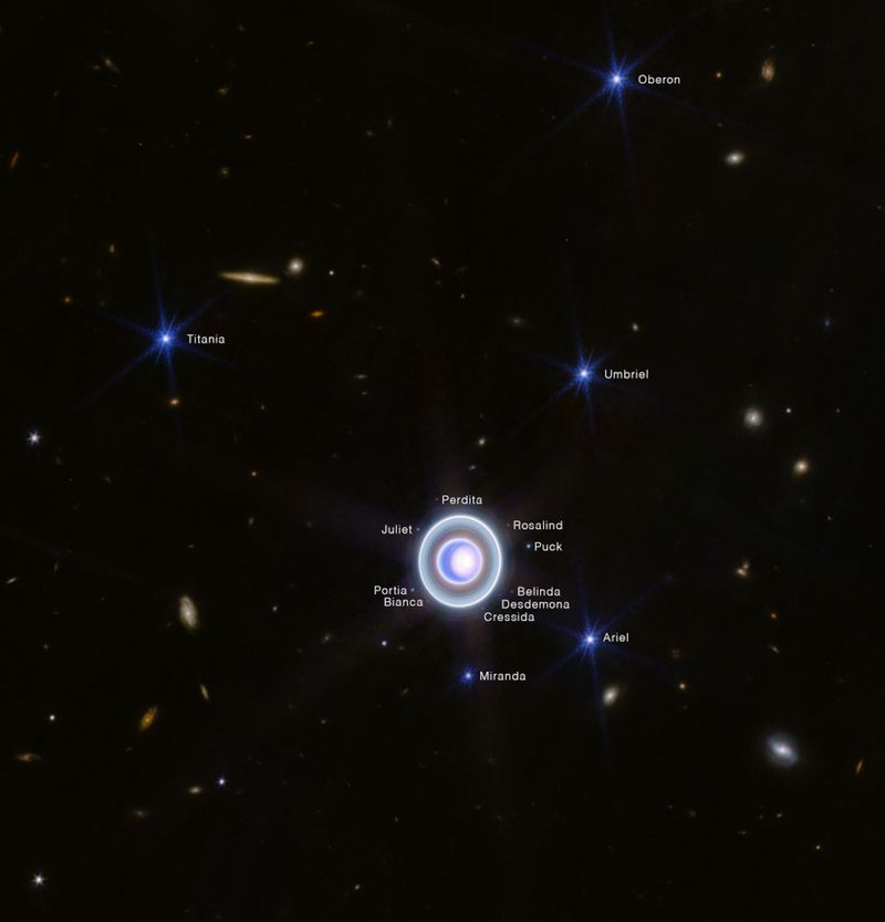 In 1986, Voyager 2 became the only spacecraft to explore ice giant planet Uranus close up. Still, this newly released image from the NIRCam (Near-Infrared Camera) on the James Webb Space Telescope offers a detailed look at the distant world. The tilted outer planet rotates on its axis once in about 17 hours. Its north pole is presently pointed near our line of sight, offering direct views of its northern hemisphere and a faint but extensive system of rings. Of the giant planet's 27 known moons, 14 are annotated in the image. Mixed with fuzzy background galaxies, the brighter moons show hints of Webb's characteristic diffraction spikes. And though these worlds of the outer Solar System were unknown in Shakespearean times, all but two of the 27 Uranian moons are named for characters in the English bard's plays.
