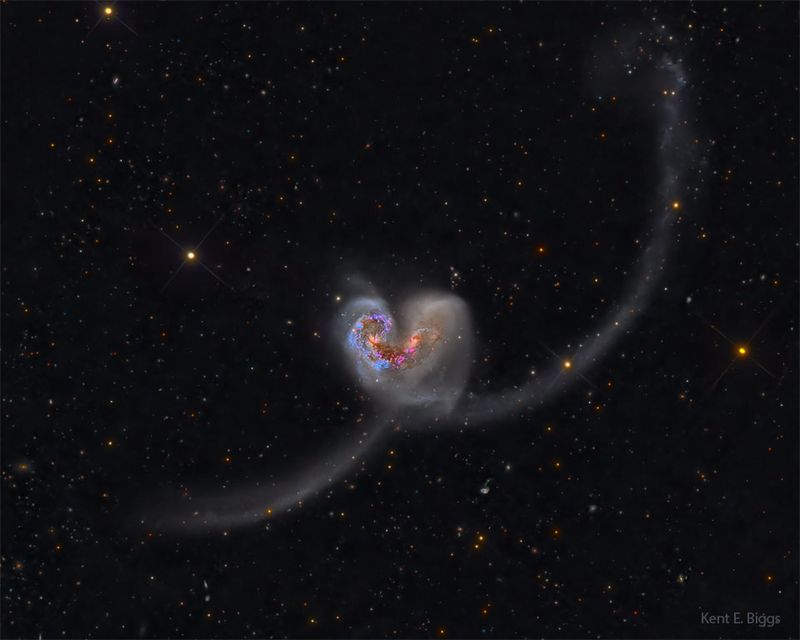 Are these two galaxies really attracted to each other? Yes, gravitationally, and the result appears as an enormous iconic heart -- at least for now. Pictured is the pair of galaxies cataloged as NGC 4038 and NGC 4039,known as the Antennae Galaxies. Because they are only 60 million light years away, close by intergalactic standards, the pair is one of the best studied interacting galaxies on the night sky. Their strong attraction began about a billion years ago when they passed unusually close to each other. As the two galaxies interact, their stars rarely collide, but new stars are formed when their interstellar gases crash together. Some new stars have already formed, for example, in the long antennae seen extending out from the sides of the dancing duo. By the time the galaxy merger is complete, likely over a billion years from now, billions of new stars may have formed. Open Science: Browse 3,300+ codes in the Astrophysics Source Code Library