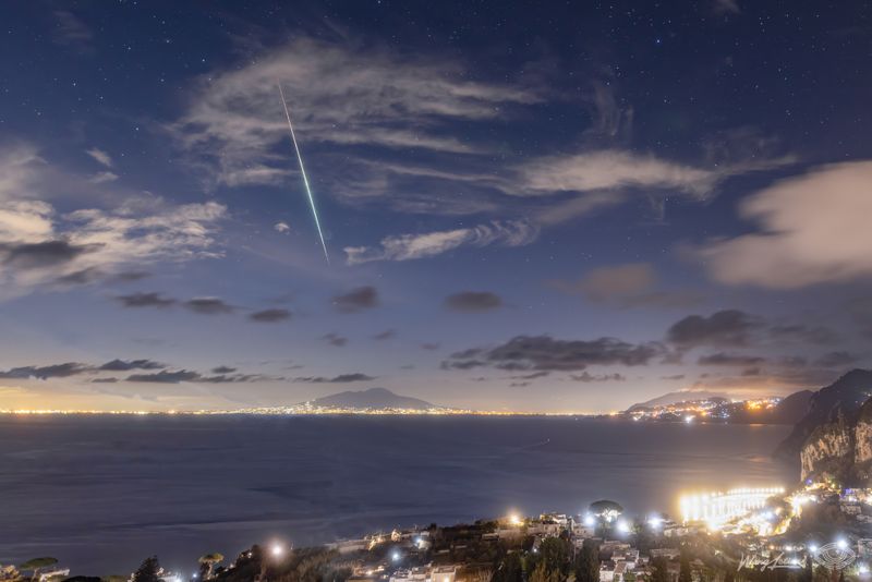 A cosmic dust grain plowing through the upper atmosphere much faster than a falling leaf created this brilliant meteor streak. In a serendipitous moment, the sublime night sky view was captured from the resort island of Capri, in the Bay of Naples, on the evening of February 8. Looking across the bay, the camera faces northeast toward the lights of Naples and surrounding cities. Pointing toward the horizon, the meteor streak by chance ends above the silhouette of Mount Vesuvius. One of planet Earth's most famous volcanos, an eruption of Mount Vesuvius destroyed the city of Pompeii in 79 AD.