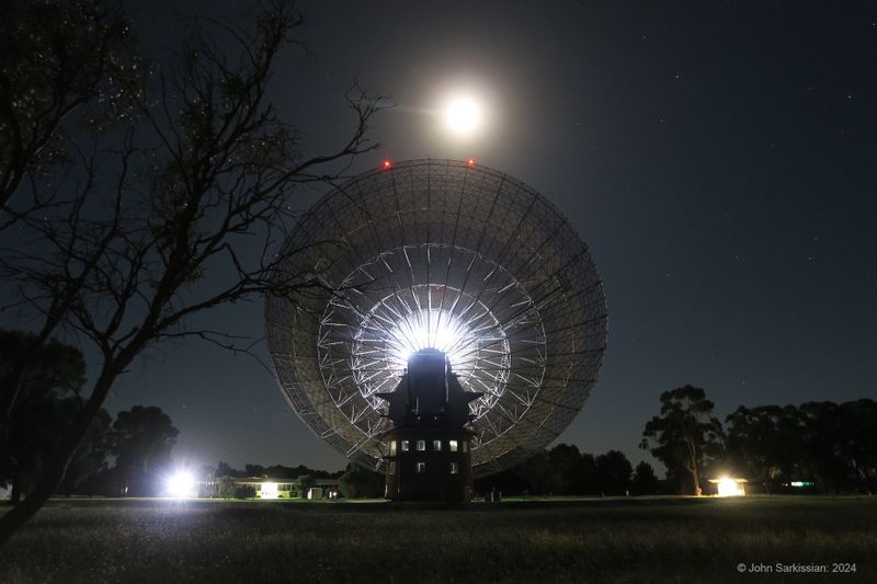Murriyang, the CSIRO’s Parkes Radio Telescope, points toward a nearly Full Moon in this image from New South Wales, Australia, planet Earth. Bathed in moonlight, the 64 meter dish is receiving weak radio signals from Odysseus, following the robotic lander's February 22 touch down some 300 kilometers north of the Moon's south pole. The landing of Odysseus represents the first U.S. landing on the Moon since the Apollo 17 mission in 1972. Odysseus' tilted orientation on the lunar surface prevents its high-gain antenna from pointing toward Earth. But the sensitivity of the large, steerable Parkes dish significantly improved the reception of data from the experiments delivered to the lunar surface by the robotic moon lander. Of course the Parkes Radio Telescope dish became famous for its superior lunar television reception during the Apollo 11 mission in 1969, allowing denizens of planet Earth to watch the first moonwalk.