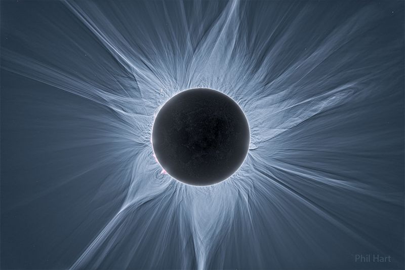 Only in the fleeting darkness of a total solar eclipse is the light of the solar corona easily visible. Normally overwhelmed by the bright solar disk, the expansive corona, the sun's outer atmosphere, is an alluring sight. But the subtle details and extreme ranges in the corona's brightness, although discernible to the eye, are notoriously difficult to photograph. Pictured here, however, using multiple images and digital processing, is a detailed image of the Sun's corona taken during the April 20, 2023 total solar eclipse from Exmouth, Australia. Clearly visible are intricate layers and glowing caustics of an ever changing mixture of hot gas and magnetic fields. Bright looping prominences appear pink just around the Sun's limb. A similar solar corona might be visible through clear skies in a narrow swath across the North America during the total solar eclipse that occurs just six days from today NASA Coverage: Total Solar Eclipse of 2024 April 8