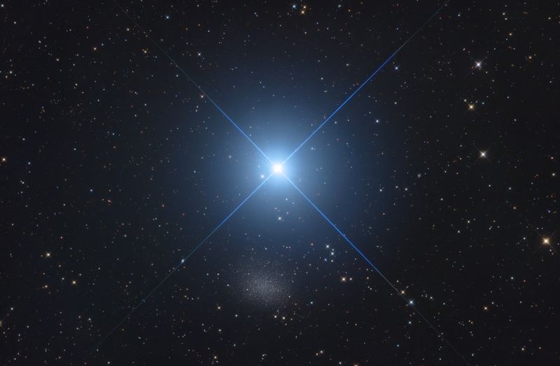 In northern hemisphere spring, bright star Regulus is easy to spot above the eastern horizon. The alpha star of the constellation Leo, Regulus is the spiky star centered in this telescopic field of view. A mere 79 light-years distant, Regulus is a hot, rapidly spinning star that is known to be part of a multiple star system. Not quite lost in the glare, the fuzzy patch just below Regulus is diffuse starlight from small galaxy Leo I. Leo I is a dwarf spheroidal galaxy, a member of the Local Group of galaxies dominated by our Milky Way Galaxy and the Andromeda Galaxy (M31). About 800 thousand light-years away, Leo I is thought to be the most distant of the known small satellite galaxies orbiting the Milky Way. But dwarf galaxy Leo I has shown evidence of a supermassive black hole at its center, comparable in mass to the black hole at the center of the Milky Way.