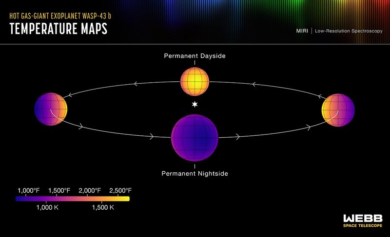 A mere 280 light-years from Earth, tidally locked, Jupiter-sized exoplanet WASP-43b orbits its parent star once every 0.8 Earth days. That puts it about 2 million kilometers (less than 1/25th the orbital distance of Mercury) from a small, cool sun. Still, on a dayside always facing its parent star, temperatures approach a torrid 2,500 degrees F as measured at infrared wavelengths by the MIRI instrument on board the James Webb Space Telescope. In this illustration of the hot exoplanet's orbit, Webb measurements also show nightside temperatures remain above 1,000 degrees F. That suggests that strong equatorial winds circulate the dayside atmospheric gases to the nightside before they can completely cool off. Exoplanet WASP-43b is now formally known as Astrolábos, and its K-type parent star has been christened Gnomon. Webb's infrared spectra indicate water vapor is present on the nightside as well as the dayside of the planet, providing information about cloud cover on Astrolábos.