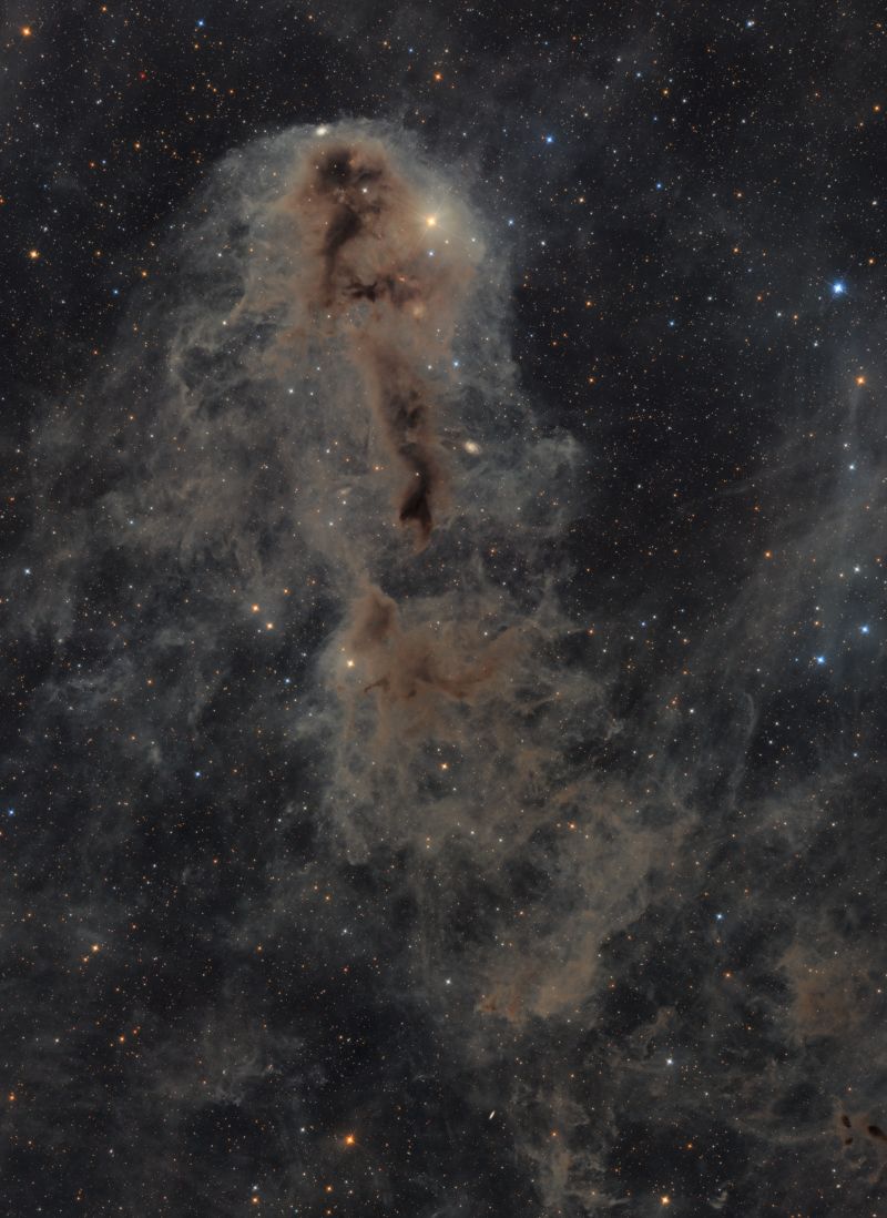 Stars are forming in Lynds Dark Nebula (LDN) 1251. About 1,000 light-years away and drifting above the plane of our Milky Way galaxy, LDN 1251 is also less appetizingly known as "The Rotten Fish Nebula." The dusty molecular cloud is part of a complex of dark nebulae mapped toward the Cepheus flare region. Across the spectrum, astronomical explorations of the obscuring interstellar clouds reveal energetic shocks and outflows associated with newborn stars, including the telltale reddish glow from scattered Herbig-Haro objects hiding in the image. Distant background galaxies also lurk in the scene, almost buried behind the dusty expanse. This alluring view spans over four full moons on the sky, or 35 light-years at the estimated distance of LDN 1251.