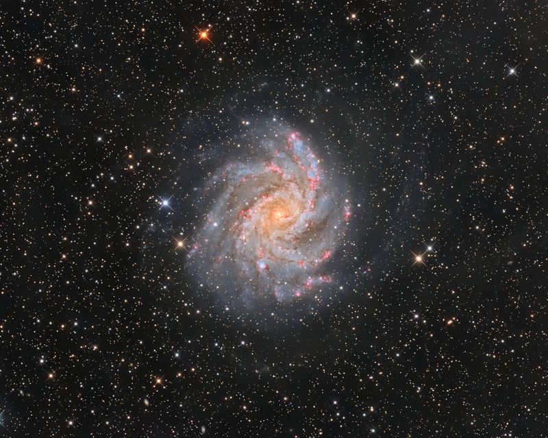 From our vantage point in the Milky Way Galaxy, we see NGC 6946 face-on. The big, beautiful spiral galaxy is located just 20 million light-years away, behind a veil of foreground dust and stars in the high and far-off constellation Cepheus. In this sharp telescopic portrait, from the core outward the galaxy's colors change from the yellowish light of old stars in the center to young blue star clusters and reddish star forming regions along the loose, fragmented spiral arms. NGC 6946 is also bright in infrared light and rich in gas and dust, exhibiting a high star birth and death rate. In fact, since the early 20th century ten confirmed supernovae, the death explosions of massive stars, were discovered in NGC 6946. Nearly 40,000 light-years across, NGC 6946 is also known as the Fireworks Galaxy.