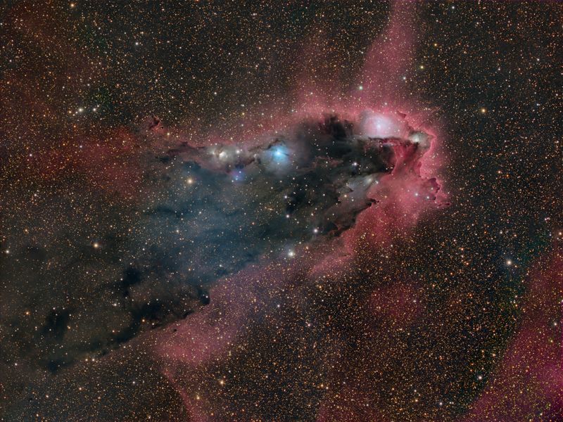 In silhouette against a crowded star field along the tail of the arachnological constellation Scorpius, this dusty cosmic cloud evokes for some the image of an ominous dark tower. In fact, monstrous clumps of dust and molecular gas collapsing to form stars may well lurk within the dark nebula, a structure that spans almost 40 light-years across this gorgeous telescopic portrait. A cometary globule, the swept-back cloud is shaped by intense ultraviolet radiation from the OB association of very hot stars in NGC 6231, off the upper right corner of the scene. That energetic ultraviolet light also powers the globule's bordering reddish glow of hydrogen gas. Hot stars embedded in the dust can be seen as bluish reflection nebulae. This dark tower and associated nebulae are about 5,000 light-years away. Growing Gallery: Moon Eclipses Saturn in August 2024