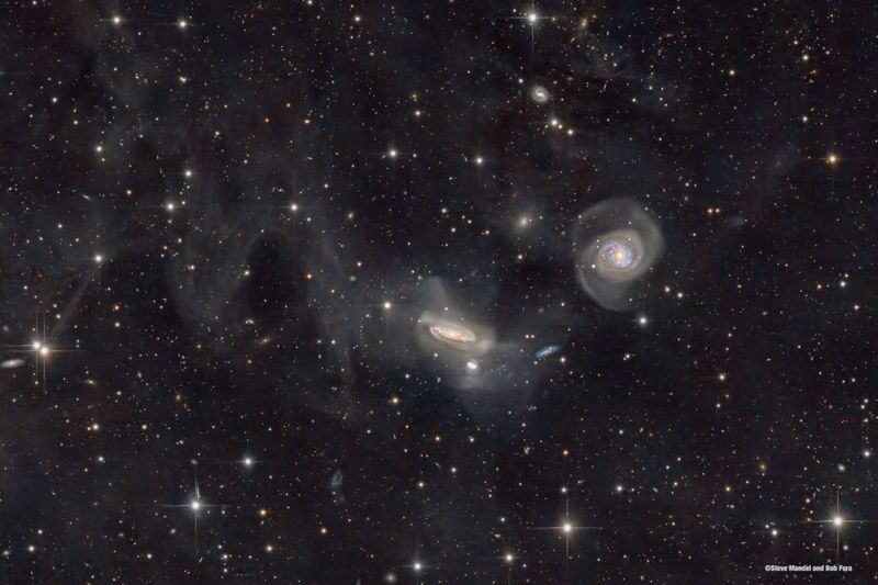 Galaxies of the NGC 7771 Group are featured in this intriguing skyscape. Some 200 million light-years distant toward the constellation Pegasus, NGC 7771 is the large, edge-on spiral near center, about 75,000 light-years across, with two smaller galaxies below it. Large spiral NGC 7769 is seen face-on to the right. Galaxies of the NGC 7771 group are interacting, making repeated close passages that will ultimately result in galaxy-galaxy mergers on a cosmic timescale. The interactions can be traced by distortions in the shape of the galaxies themselves and faint streams of stars created by their mutual gravitational tides. But a clear view of this galaxy group is difficult to come by as the deep image also reveals extensive clouds of foreground dust sweeping across the field of view. The dim, dusty galactic cirrus clouds are known as Integrated Flux Nebulae. The faint IFN reflect starlight from our own Milky Way Galaxy and lie only a few hundred light-years above the galactic plane.