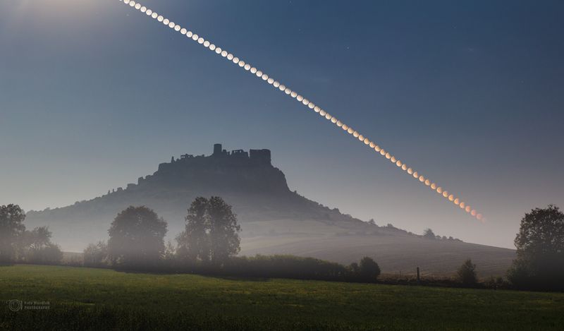 For northern hemisphere dwellers, September's Full Moon was the Harvest Moon. On September 17/18 the sunlit lunar nearside passed into shadow, just grazing Earth's umbra, the planet's dark, central shadow cone, in a partial lunar eclipse. Over the two and a half hours before dawn a camera fixed to a tripod was used to record this series of exposures as the eclipsed Harvest Moon set behind Spiš Castle in the hazy morning sky over eastern Slovakia. Famed in festival, story, and song, Harvest Moon is just the traditional name of the full moon nearest the autumnal equinox. According to lore the name is a fitting one. Despite the diminishing daylight hours as the growing season drew to a close, farmers could harvest crops by the light of a full moon shining on from dusk to dawn. This September's Harvest Moon was also known to some as a supermoon, a term becoming a traditional name for a full moon near perigee.