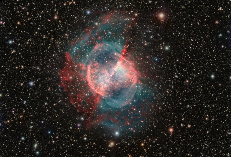 While hunting for comets in the skies above 18th century France, astronomer Charles Messier diligently kept a list of the things encountered during his telescopic expeditions that were definitely not comets. This is number 27 on his now famous not-a-comet list. In fact, 21st century astronomers would identify it as a planetary nebula, but it's not a planet either, even though it may appear round and planet-like in a small telescope. Messier 27 (M27) is an excellent example of a gaseous emission nebula created as a sun-like star runs out of nuclear fuel in its core. The nebula forms as the star's outer layers are expelled into space, with a visible glow generated by atoms excited by the dying star's intense but invisible ultraviolet light. Known by the popular name of the Dumbbell Nebula, the beautifully symmetric interstellar gas cloud is over 2.5 light-years across and about 1,200 light-years away in the constellation Vulpecula. This impressive color image highlights details within the well-studied central region and fainter, seldom imaged features in the nebula's outer halo.