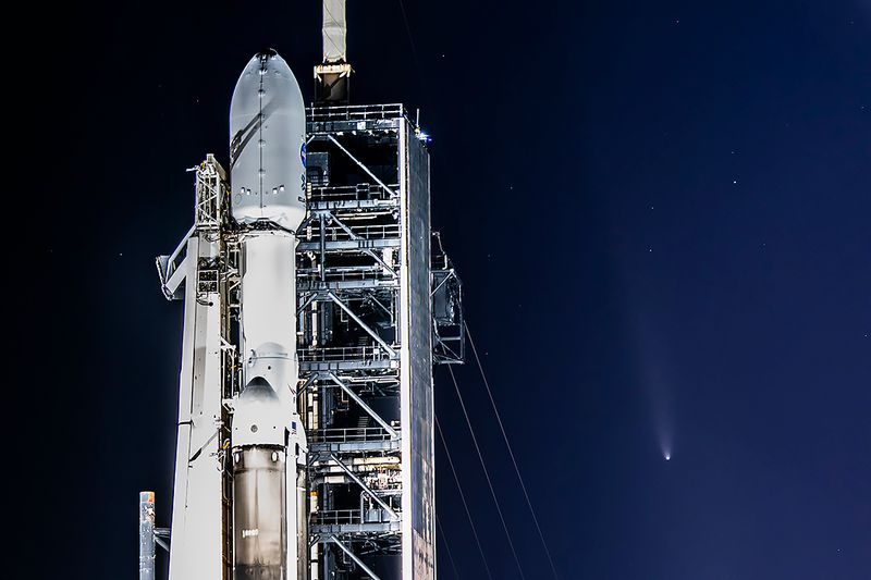 NASA's Europa Clipper is now headed toward an ocean world beyond Earth. The large spacecraft is tucked into the payload fairing atop the Falcon Heavy rocket in this photo, taken at Kennedy Space Center the day before the mission's successful October 14 launch. Europa Clipper's interplanetary voyage will first take it to Mars, then back to Earth, and then on to Jupiter on gravity assist trajectories that will allow it to enter orbit around Jupiter in April 2030. Once orbiting Jupiter, the spacecraft will fly past Europa 49 times, exploring a Jovian moon with a global subsurface ocean that may have conditions to support life. Posing in the background next to the floodlit rocket is Comet Tsuchinsan-ATLAS, about a day after the comet's closest approach to Earth. A current darling of evening skies, the naked-eye comet is a visitor from the distant Oort cloud Growing Gallery: Comet Tsuchinshan-ATLAS in 2024