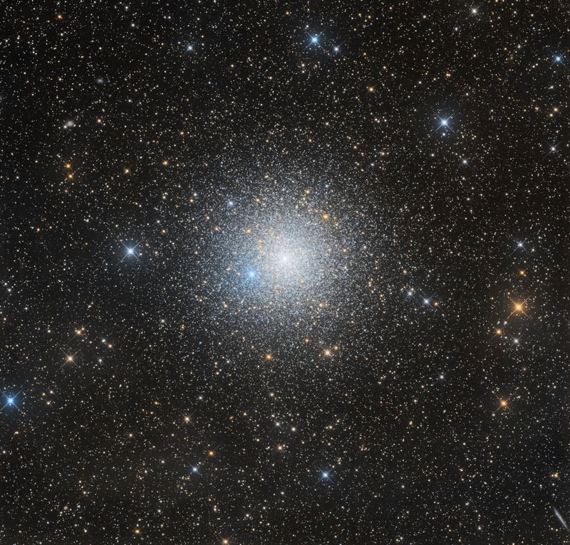 Some 13,000 light-years away toward the southern constellation Pavo, the globular star cluster NGC 6752 roams the halo of our Milky Way galaxy. Over 10 billion years old, NGC 6752 follows clusters Omega Centauri, 47 Tucanae, and Messier 22 as the fourth brightest globular in planet Earth's night sky. It holds over 100 thousand stars in a sphere about 100 light-years in diameter. Telescopic explorations of NGC 6752 have found that a remarkable fraction of the stars near the cluster's core are multiple star systems. They also reveal the presence of blue straggle stars, stars which appear to be too young and massive to exist in a cluster whose stars are all expected to be at least twice as old as the Sun. The blue stragglers are thought to be formed by star mergers and collisions in the dense stellar environment at the cluster's core. This sharp color composite also features the cluster's ancient red giant stars in yellowish hues. (Note: The bright, spiky blue star about 8 o'clock from the cluster center is a foreground star along the line-of-sight to NGC 6752)
