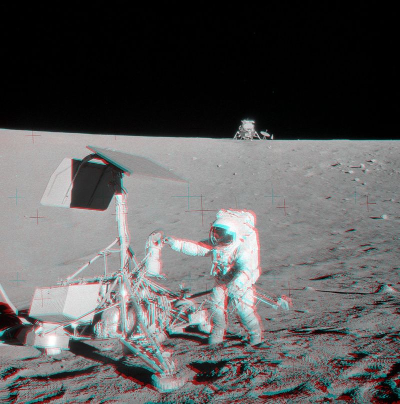 Put on your red/blue glasses and gaze across the western Ocean of Storms on the surface of the Moon. The 3D anaglyph features Apollo 12 astronaut Pete Conrad visiting the Surveyor 3 spacecraft in November of 1969. Surveyor 3 had landed at the site on the inside slope of a small crater about 2 1/2 years earlier in April of 1967. Visible on the horizon beyond the far crater wall, Apollo 12's Lunar Module Intrepid touched down less than 200 meters (650 feet) away, easy moonwalking distance from the robotic Surveyor spacecraft. This stereo image was carefully created from two separate pictures (AS12-48-7133, AS12-48-7134) captured on the lunar surface. They depict the scene from only slightly different viewpoints, approximating the separation between human eyes.