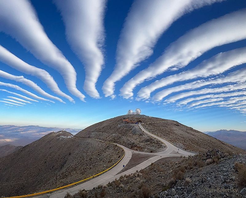 What's happening with these clouds? While it may seem that these long and thin clouds are pointing toward the top of a hill, and that maybe a world-famous observatory is located there, only part of that is true. In terms of clouds, the formation is a chance superposition of impressively periodic undulating air currents in Earth's lower atmosphere. Undulatus, a type of Asperitas cloud, form at the peaks where the air is cool enough to cause the condensation of opaque water droplets. The wide-angle nature of the panorama creates the illusion that the clouds converge over the hill. In terms of land, there really is a world-famous observatory at the top of that peak: the Carnegie Science's Las Campanas Observatory in the Atacama Desert of Chile. The two telescope domes visible are the 6.5-meter Magellan Telescopes. The featured coincidental vista was a surprise but was captured by the phone of a quick-thinking photographer in late September. Your Sky Surprise: What picture did APOD feature on your birthday? (post 1995)