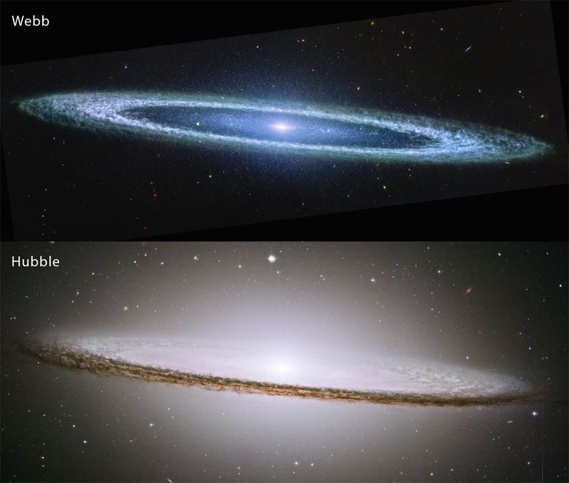 This floating ring is the size of a galaxy. In fact, it is a galaxy -- or at least part of one: the photogenic Sombrero Galaxy is one of the largest galaxies in the nearby Virgo Cluster of Galaxies. The dark band of dust that obscures the mid-section of the Sombrero Galaxy in visible light (bottom panel) actually glows brightly in infrared light (top panel). The featured image shows the infrared glow in false blue, recorded recently by the space-based James Webb Space Telescope (JWST) and released yesterday, pictured above an archival image taken by NASA's Hubble Space Telescope in visible light. The Sombrero Galaxy, also known as M104, spans about 50,000 light years and lies 28 million light years away. M104 can be seen with a small telescope in the direction of the constellation Virgo.